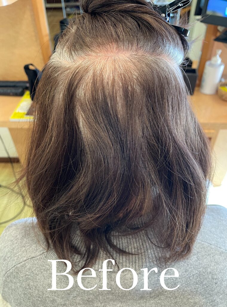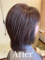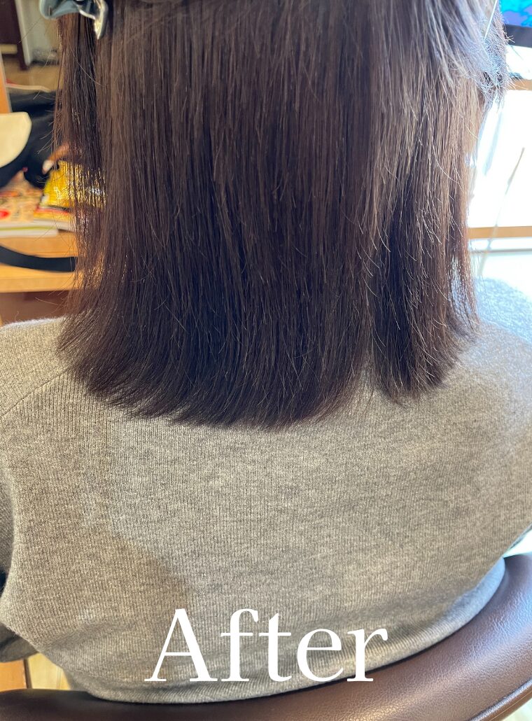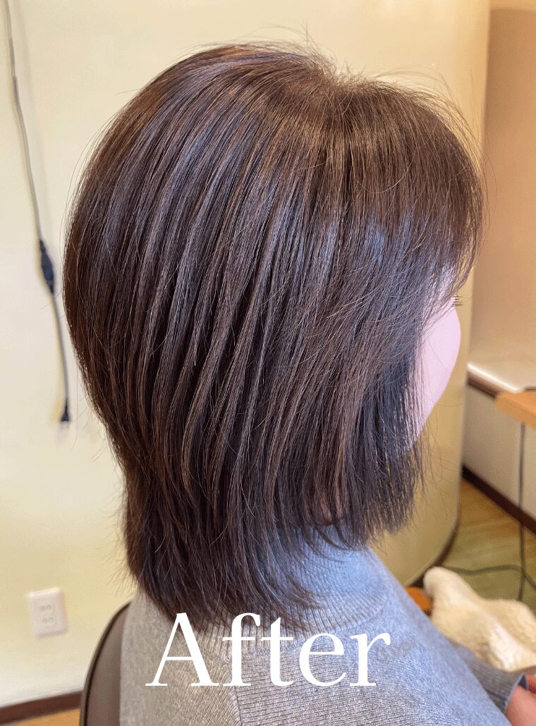 | ご相談内容 | • カラー剤が頭皮につくと腫れやすいアレルギー体質 • 明るめのカラーにしたいけれど、刺激が心配 • 縮毛矯正をするとまっすぐになりすぎて、ボリュームがなくなる • ペタンとした印象になるのが嫌で、縮毛矯正をあきらめていた |